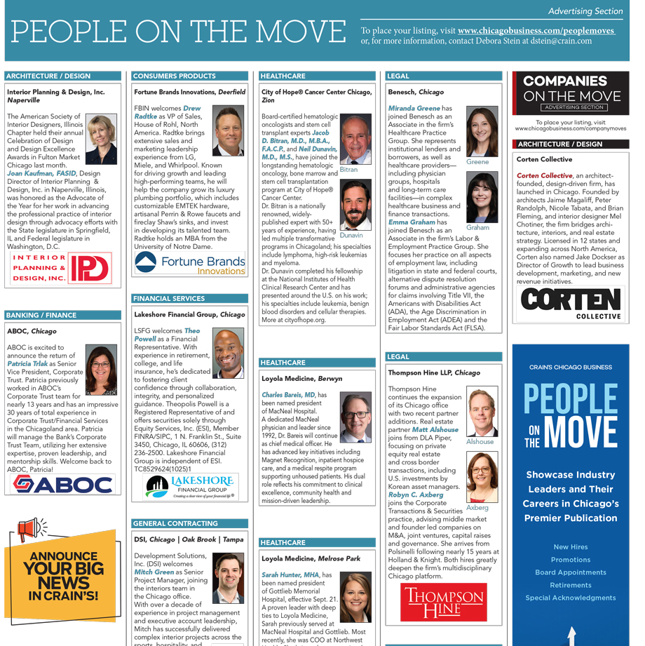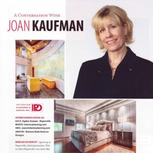 2020 Design Influencer Award, 2019 Design Excellence Award, 2019 Best of Naperville Award, Contract Magazine | ASID Selects Five Fellows for 2015, April 17, 2015 2015 ASID Design Award in the category of Contract Project by a Small Firm for Springbrook Animal Care Center in Naperville, IL American Society of Interior Designers Honor, April 24, 2015 Daily Herald Business Ledger, May 10, 2015 Glacer Magazine | 2014 Favorite Interior Designer Award, 2014 Amercian Society of Interior Designers | National Presidential Citation Award, 2014 WGN Radio’s Bill Moller Show, February 22, 2014 Naperville Magazine | Business Briefs, December 2013/January 2014 Daily Herald | Naperville Deisgner Wins Chapter Medalist Award, November 29, 2013 Naperville Sun | Tree gets Feng Shui design for Rialto festival, December 14, 2012 Naperville Sun | Springbrook Animal Care Center Opens, November 14, 2013 Suburban Woman News | Grand Opening: The Springbrook Animal Care Clinic, September 2013 Northern Illinois Real Estate Magazine | Joan Kaufman elected to the ASID National Board of Directors, January 2013 Chicago Tribune | Empty nesters adapting to evolving Christmas, December 7, 2011 Realtor Magazine | Don’t Underestimate Design, September 2011 Realtor Magazine | Think Outside the Cubicle, July/August 2011 Realtor Magazine | All That Jazz, June 2011 Daily Herald Online | Nonprofit design spaces for groups in need, November 19, 2010 Daily Herald Suburban Parent | Putting personality into teen’s rooms, November 3, 2010 Daily Herald Home and Garden | Take Mother Nature’s cures for trendiest hues, October 31, 2010 I4 Design Magazine | President’s Letter, Fall 2010 Illinois Alumni | House Beautiful, May/June 2010 Naperville Sun | Choose antique and know where to put it after, April 30, 2010 Daily Herald | A foyer or mud room can be your family command center, February 6, 2010 San Jose Mercury News | Custom craftsmanship, efficiency making a comeback, December 18, 2009 Best of Naperville Award | Interior Design, 2009 Naperville Sun | Harmony in Nature, December 2009 Office Insight | ASID-Illinois Chapter Board of Directors to be led by Joan Kaufman, November 30, 2009 HomeFashion Magazine eWeekly Newsletter | Kaufman Elected President of ASID-IL, October 2009 Kitchen & Bath Design News