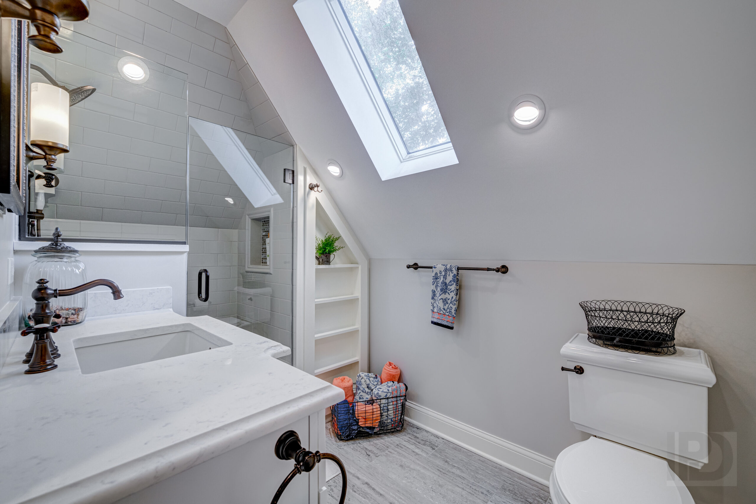 Nestled under the eaves the attic, this cozy bathroom utilizes every inch. Seated areas were placed at lower elevations.