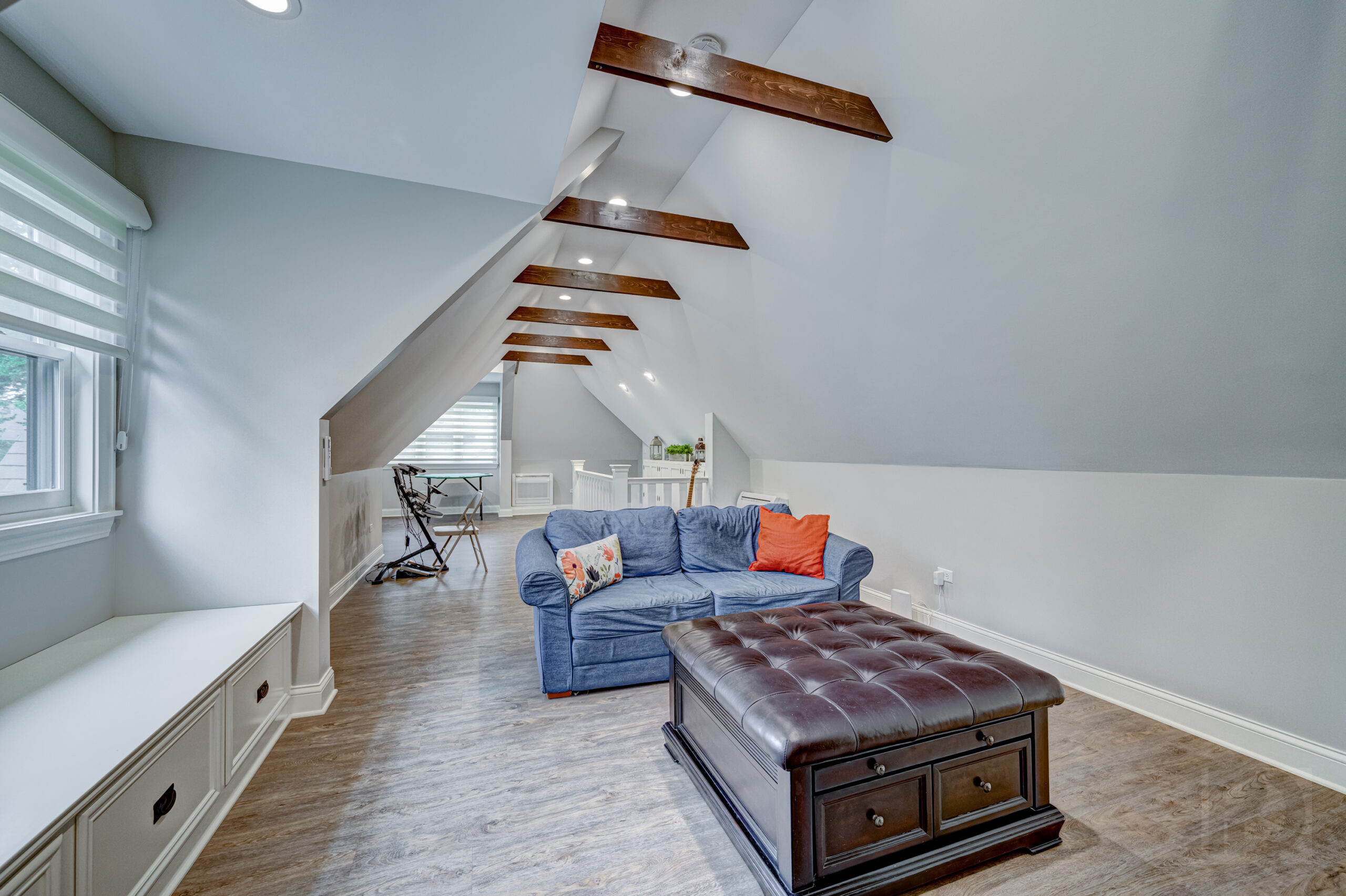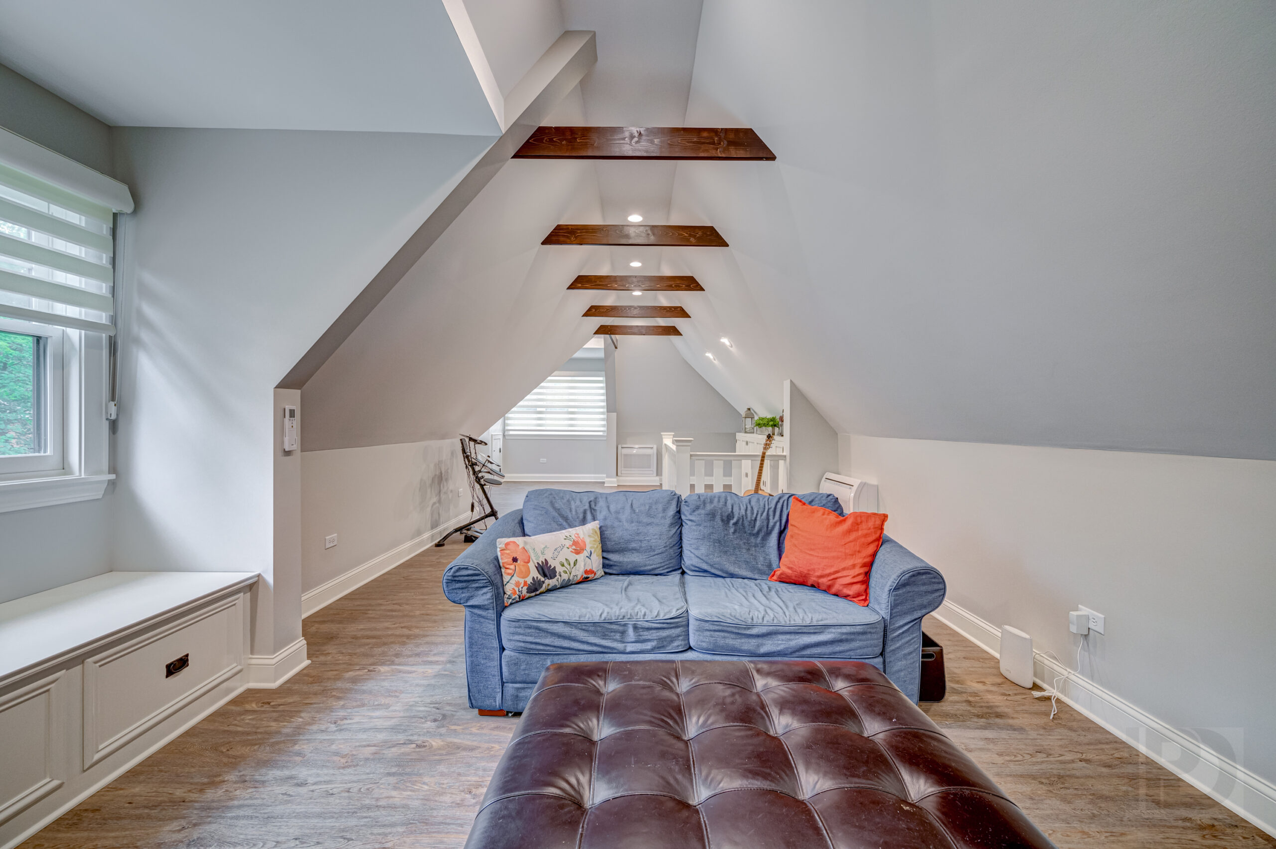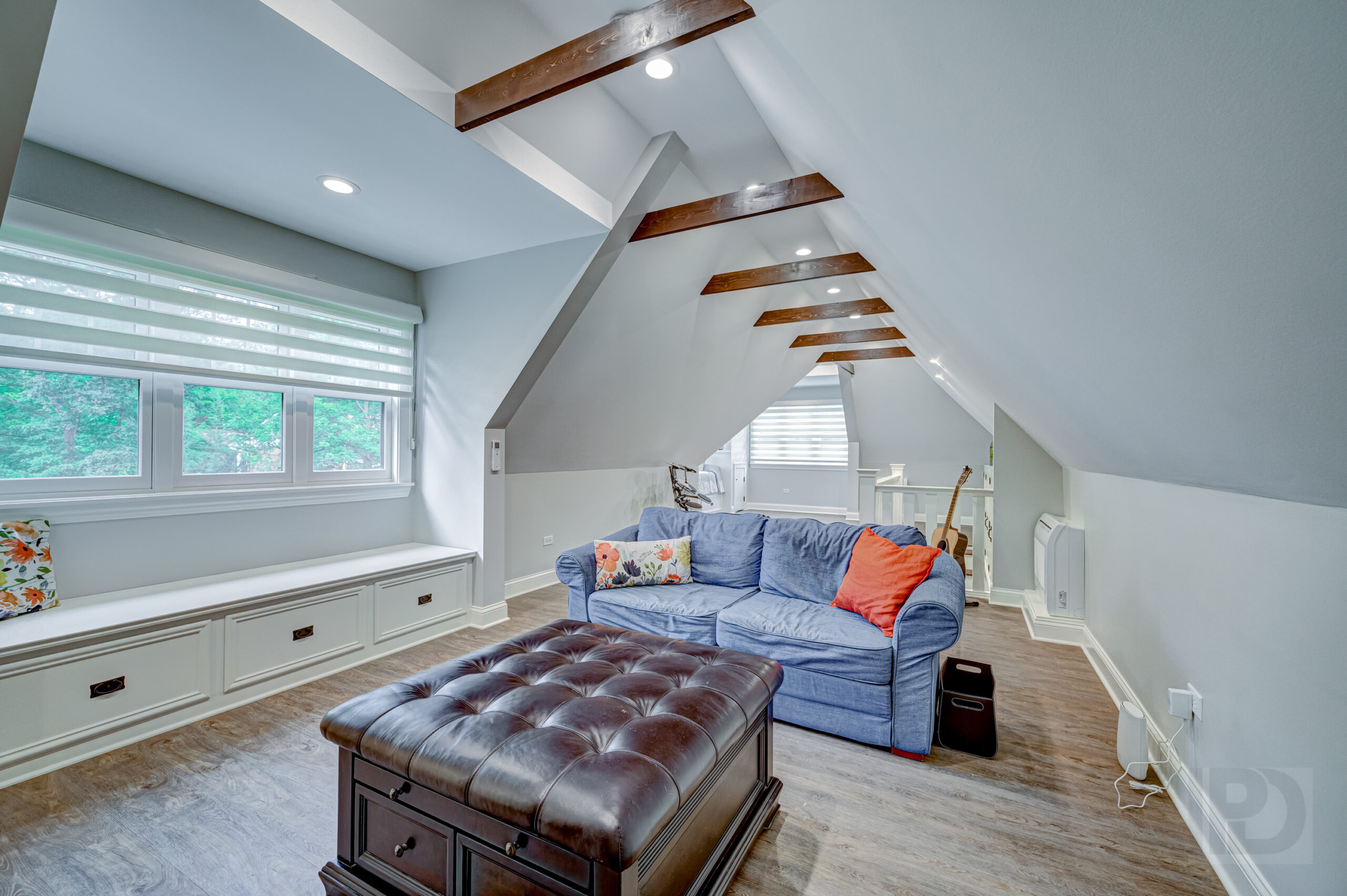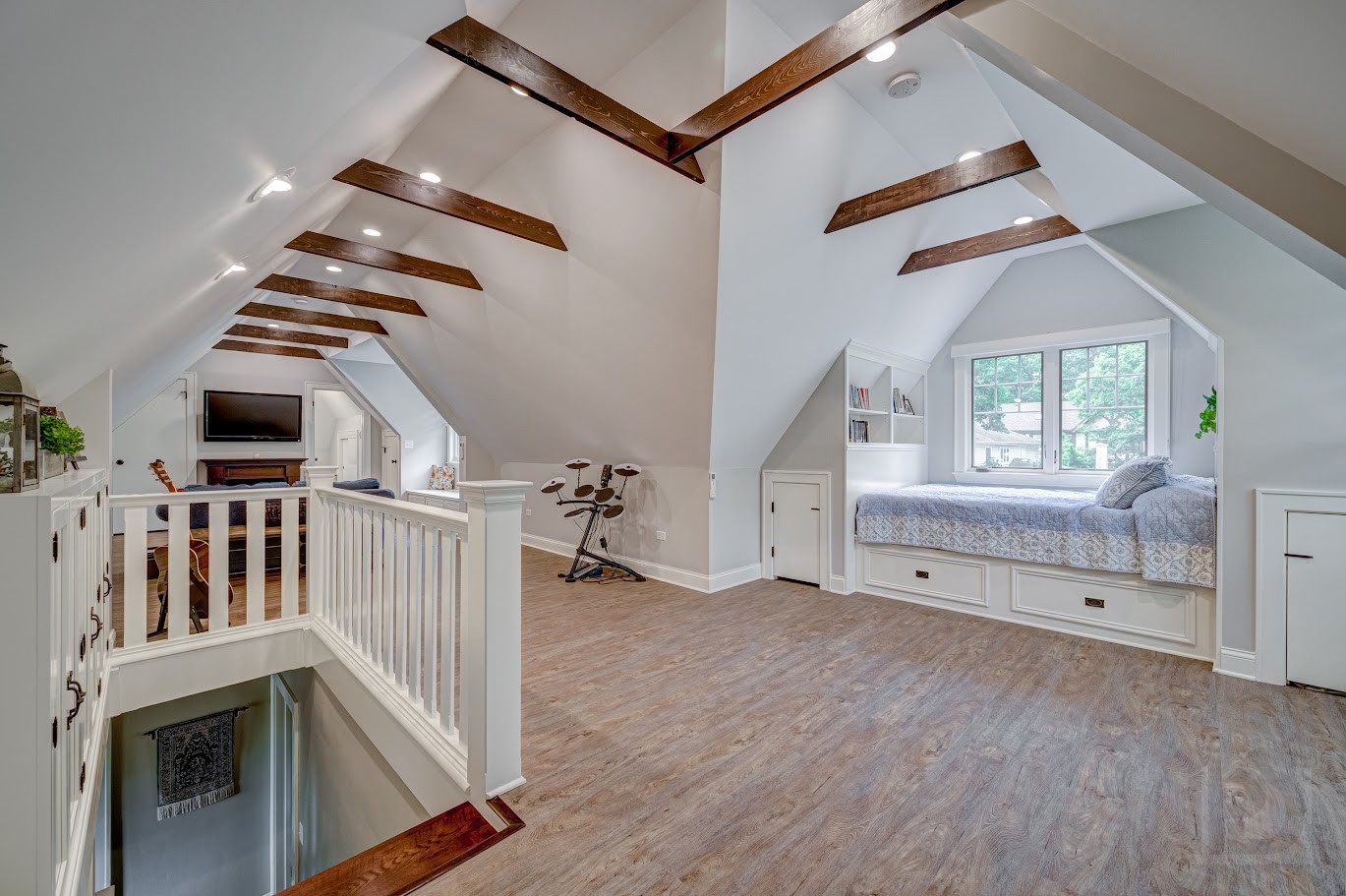 The open area of the attic features faux beams and wood-look LVT for a realistic yet low maintenance flooring solution.