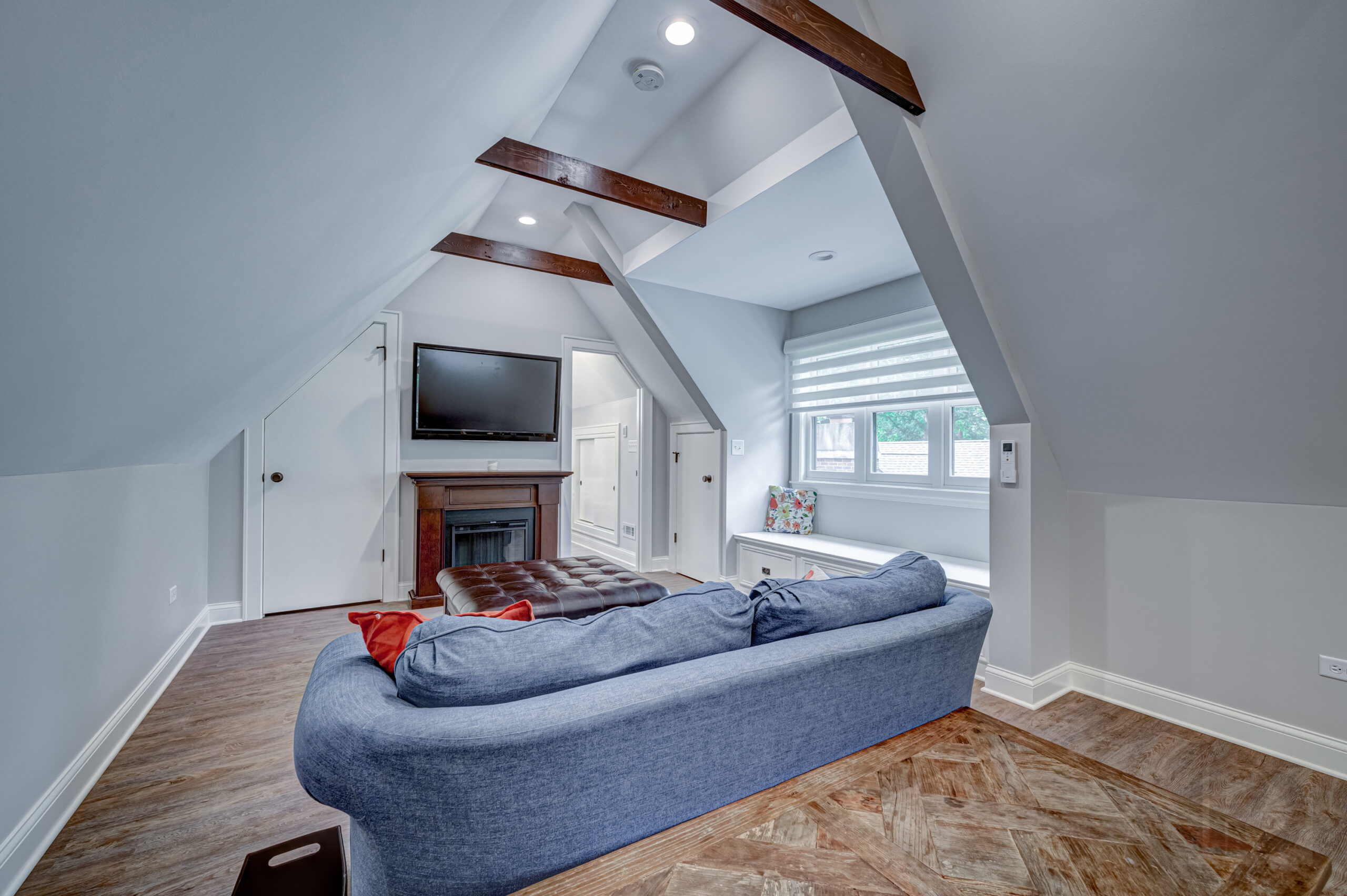 Our design successfully transformed attic into a fully usable space complete with bathroom and built-in bed for guests. Adding a fireplace allowed us to anchor the seating area creating a point of focus.