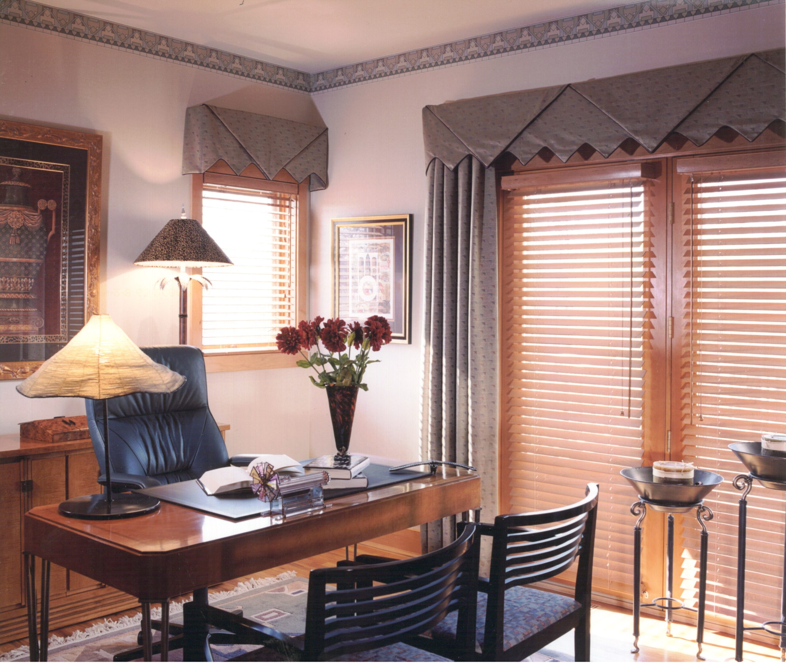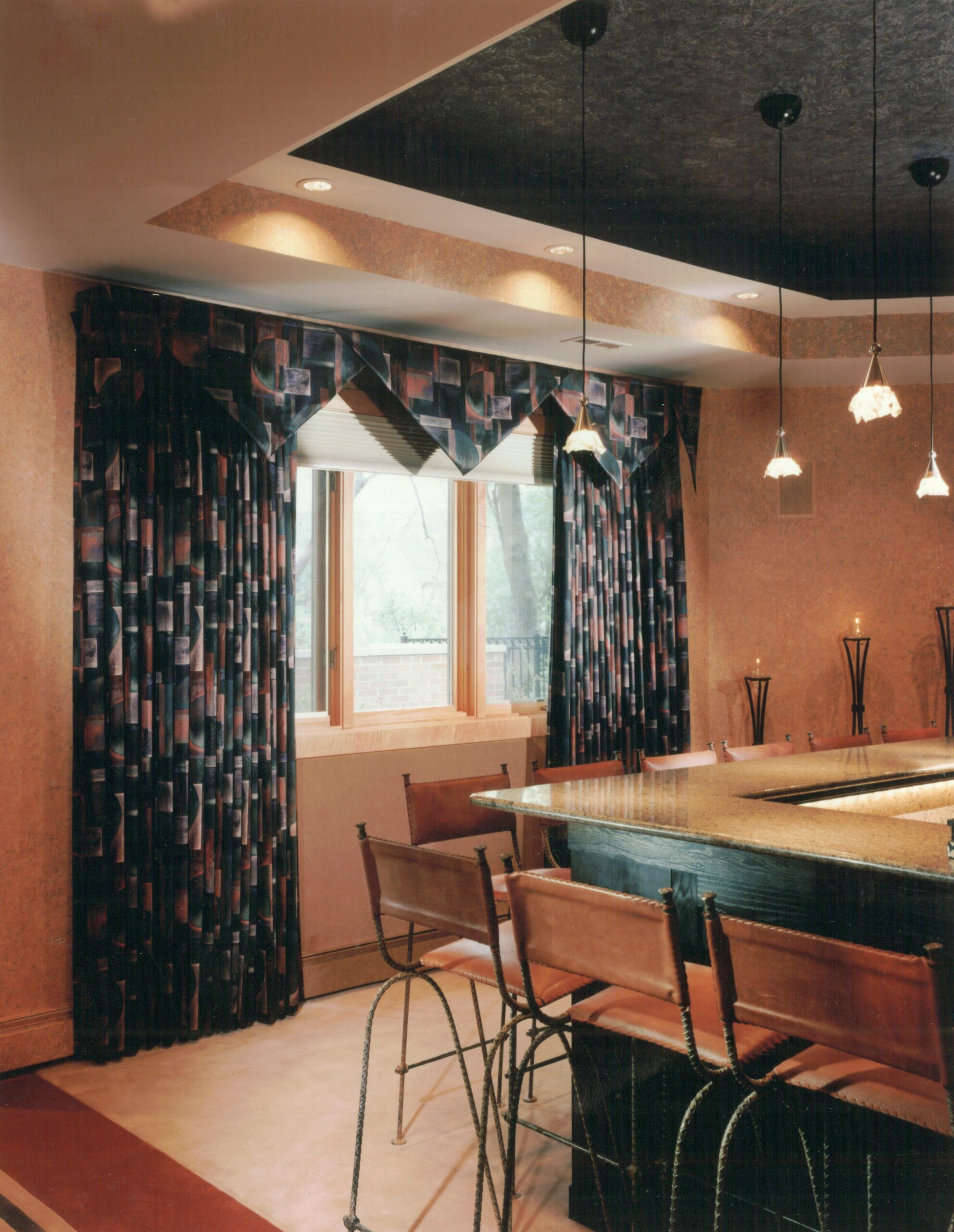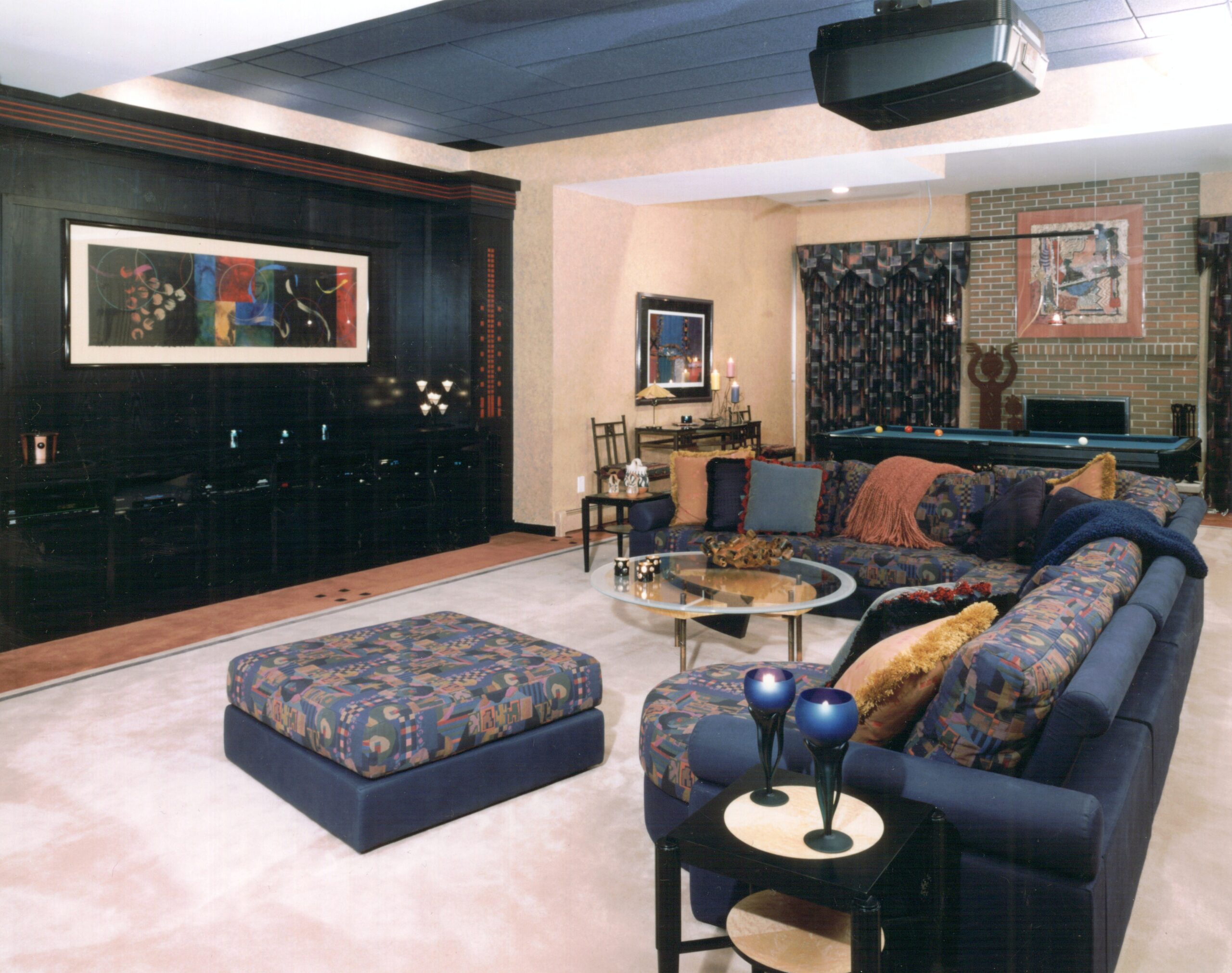 We carefully curated the furniture and finishes to add color using geometric patterns for interest, creating a fun, vibrant entertaining space. Patterned insets in the carpet and wood work connect the space with expertly designed multi-function lighting complete with automation for lighting, AV equipment and window treatments for a state-of-the-art in home theater.