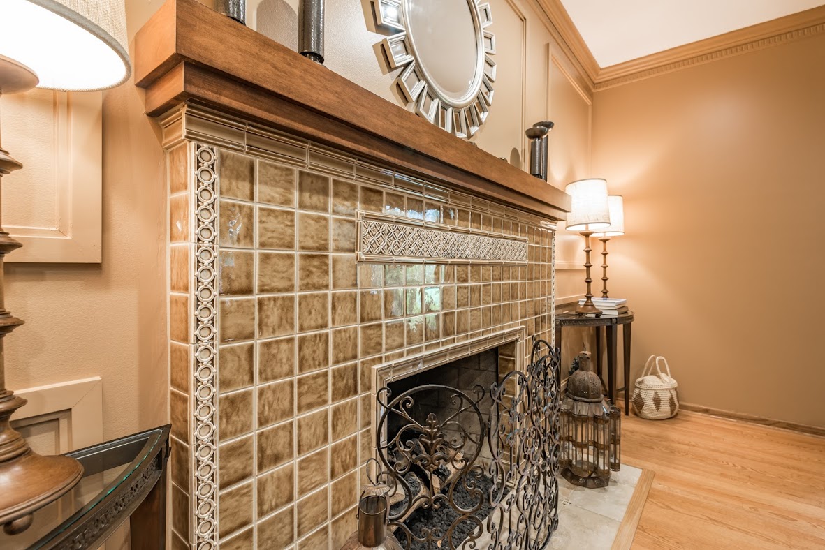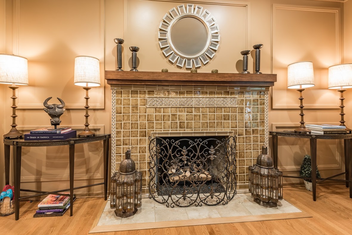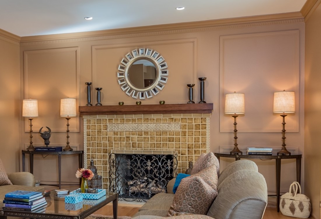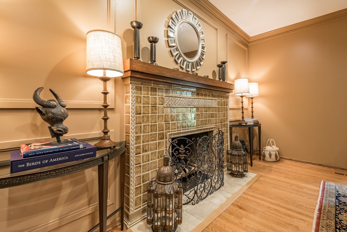 Intricate details and patterns in glazed tile abound for this fabulous fireplace. We designed a millwork molding pattern on the walls to add dimension and interest. The accent tiles complete the design with Moroccan overtones to complement our client’s significant art and artifact collection. Each tile was hand glazed and designed with precision and intent. We carefully curated the accessories including a timeless round mirror, bronze accent side console tables, and Moroccan- style lamps to provide symmetry and style. The fire grate was hand selected at an antique shop to complete the design.