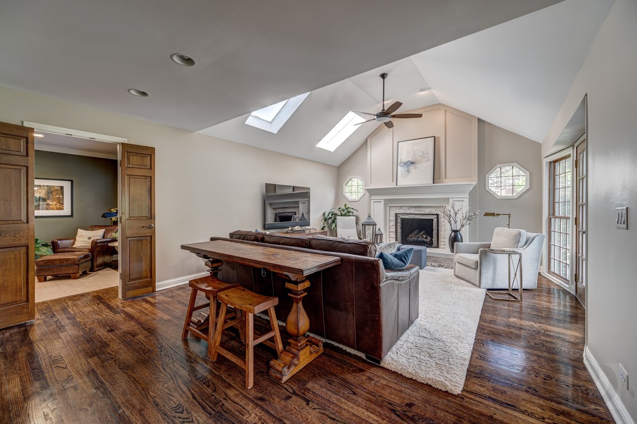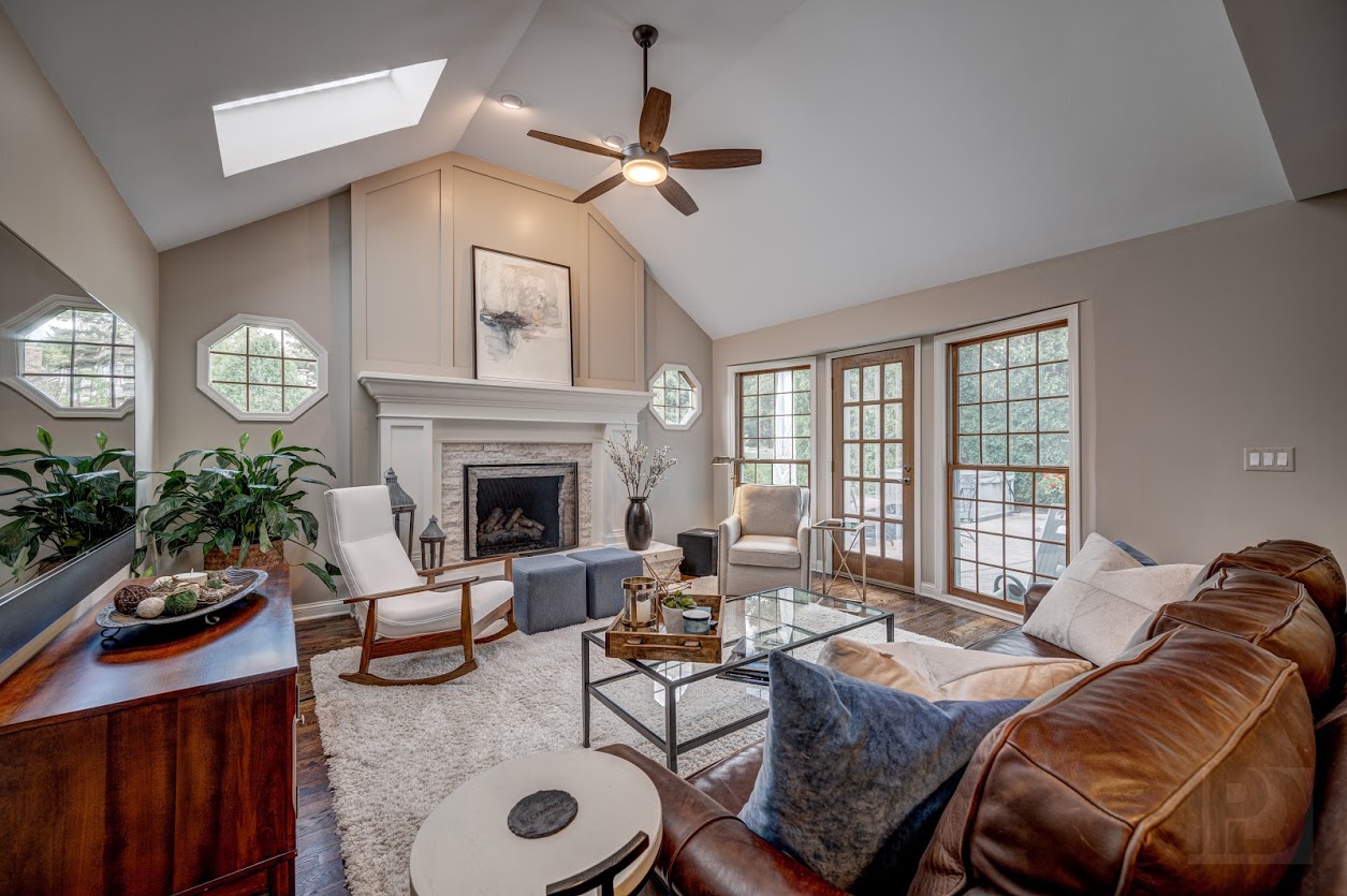 The space was completely re-designed,  focusing on the two-story fireplace to transform this family centered space. By ee-cladding the red brick with a wood and quartzite surround, and adding moldings to the ceiling in soft grey/beige, we added an updated backdrop that is welcoming and inviting. . The new design for the fireplace surround incorporated arched lines that complement the new mantle with white trim. We chose to paint in warm taupe tones that add warmth to the backdrop, creating a cozy family retreat. We chose scenic art, adding drama to the fireplace. Incorporating new wall wash can lights provides soft, much needed additional lighting at night including dimmers/ lighting control. As a finishing touch, we selected a new area rug that brings in the colors, completing the space with style.