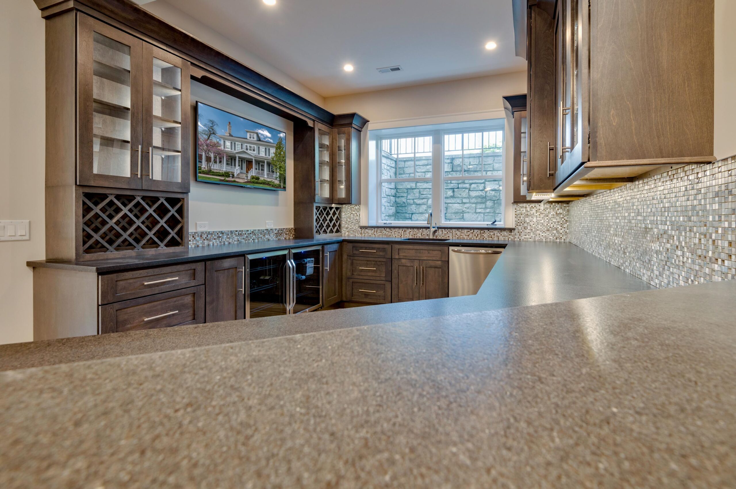 As part of this complete lower-level design, we had stone installed inside the window wells to enhance the view. We completed this bar area, an open stair design, entertaining space, guest bedroom and bathroom.