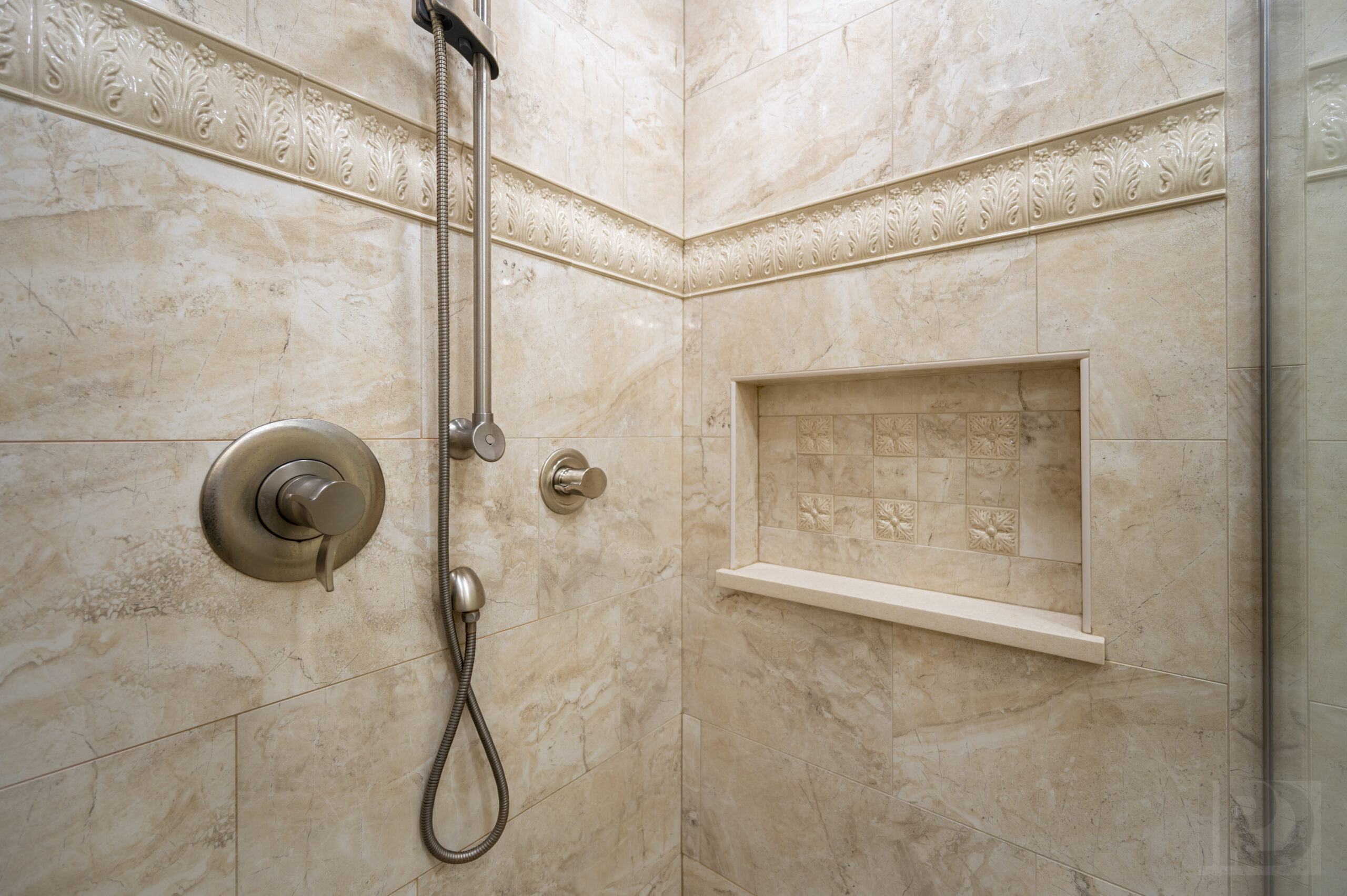 The bath includes both a tub and full-service spa shower for maximum comfort and enjoyment. Soft, neutral colors with elegant tile details and ample storage space complete the look with grace and style.