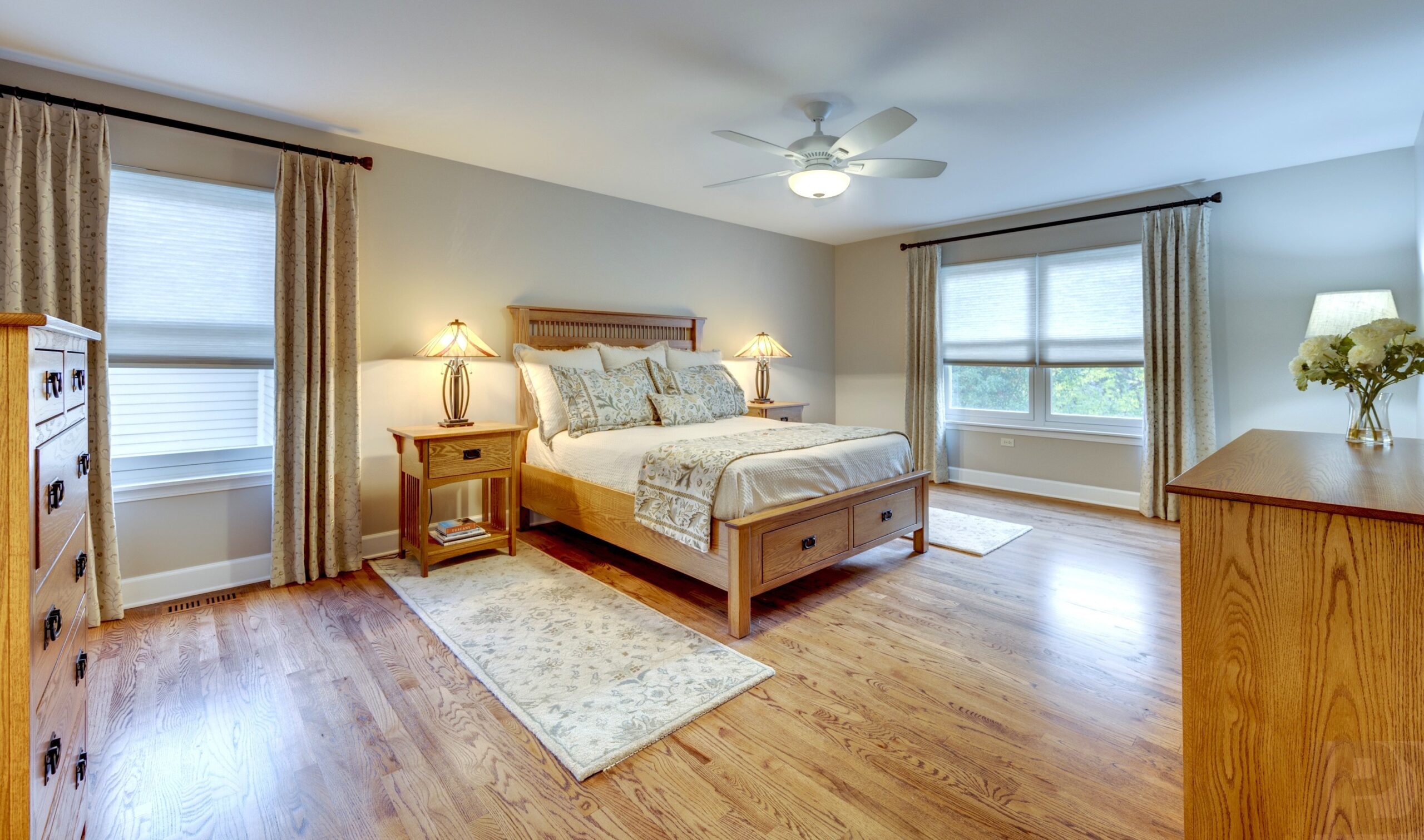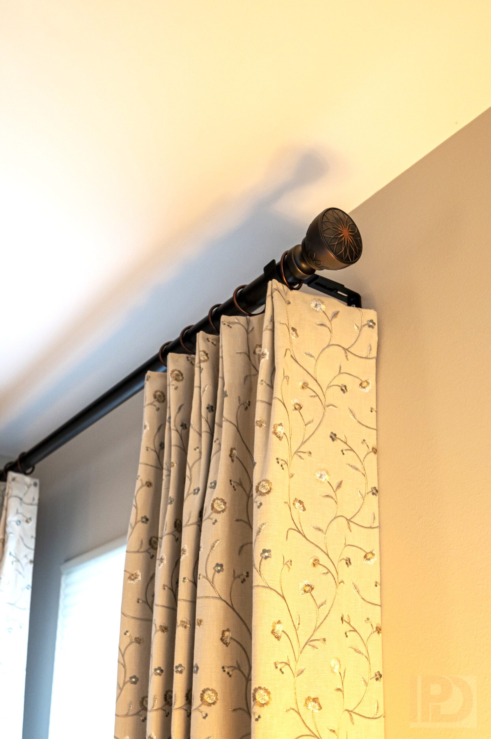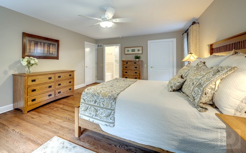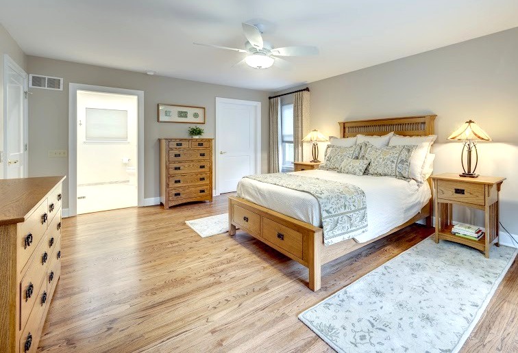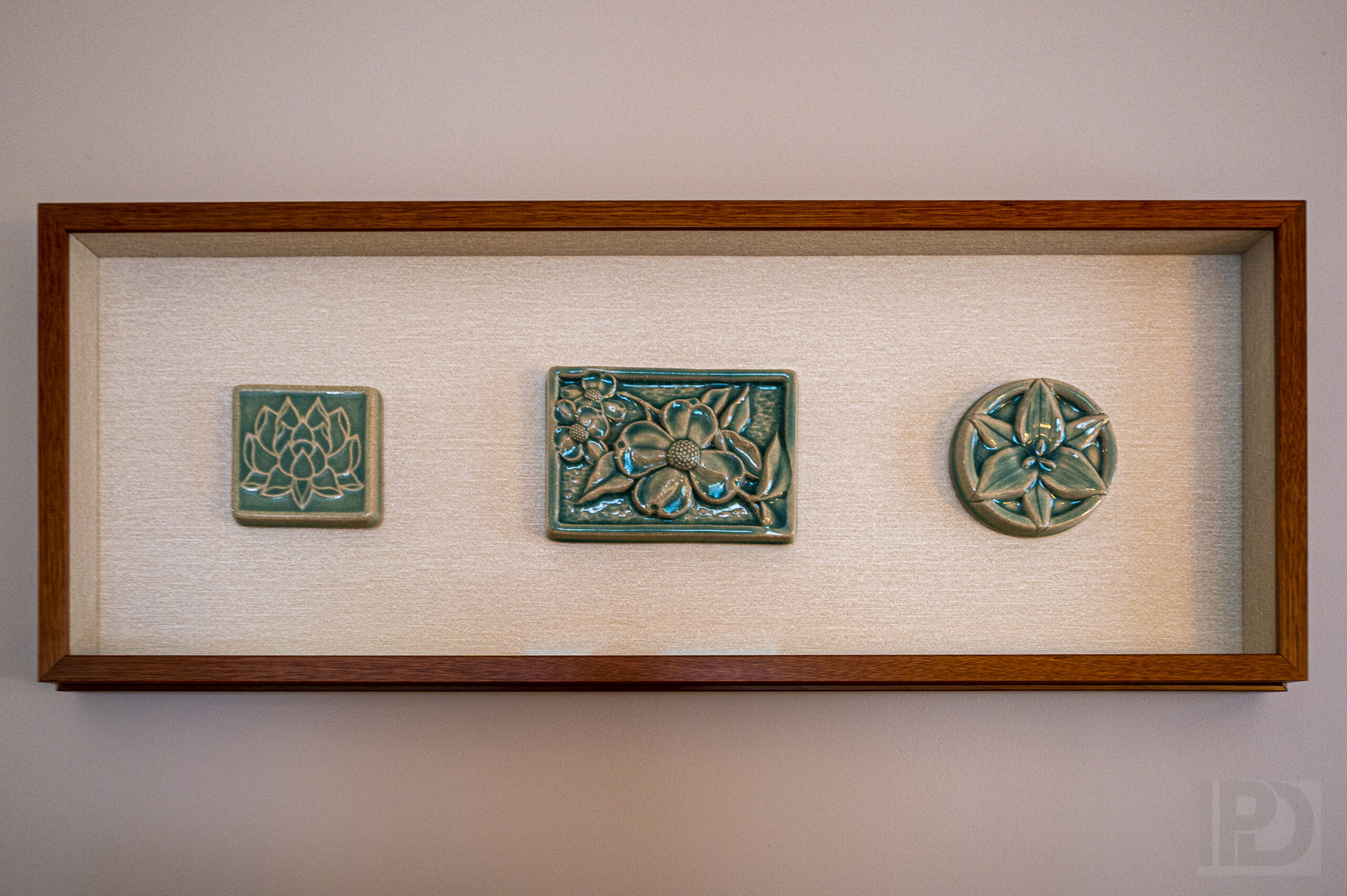 This Prairie style design is our client’s favorite, and it reflects the design of the home. We re-designed the bedroom suite, incorporating arts and crafts style furnishings and William Morris fabric floral patterns and bronze accents for the custom bedding and draperies. We chose hand painted Pewabic pottery and framed it to create custom artwork that highlights the arts and crafts details.