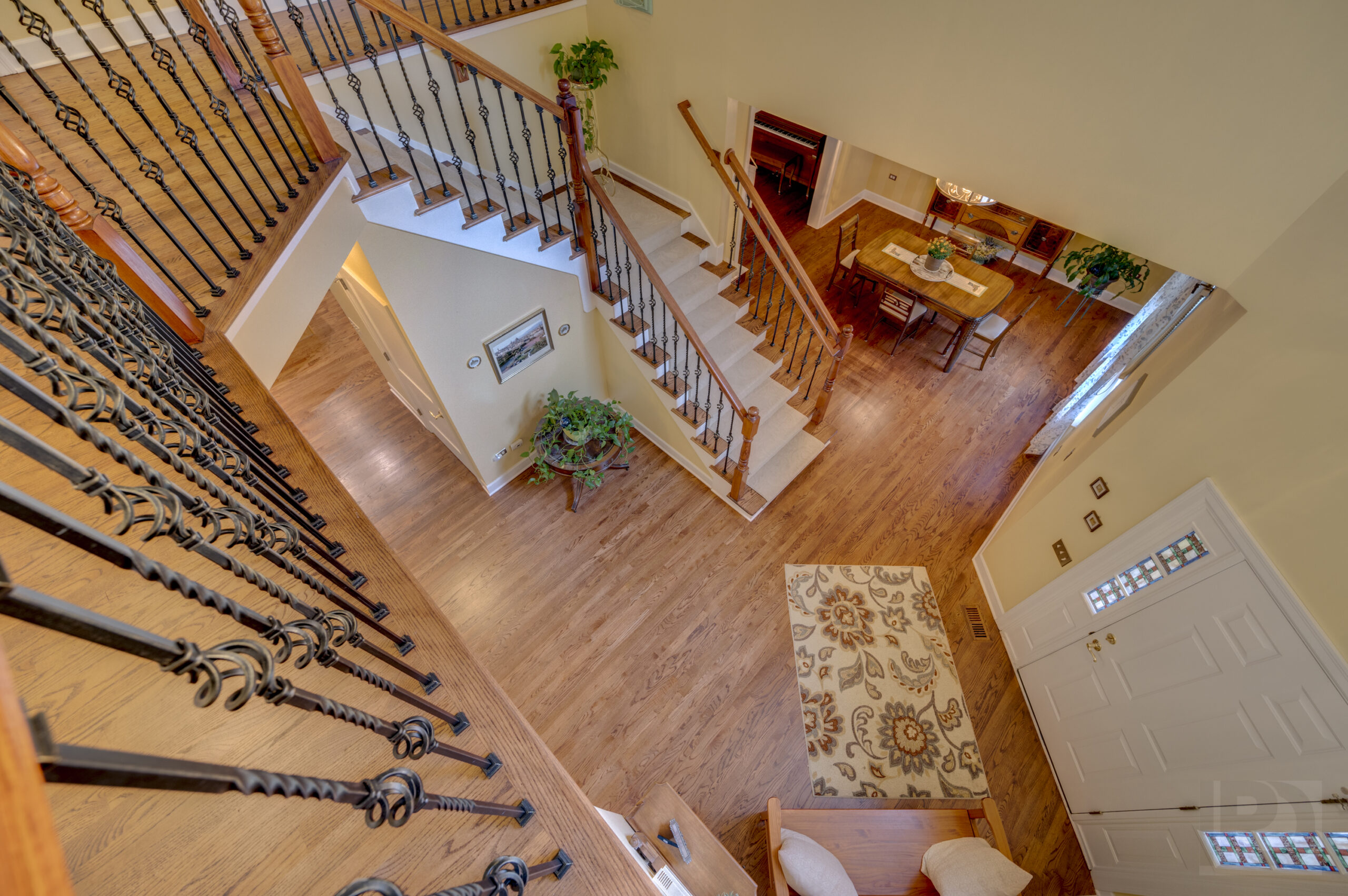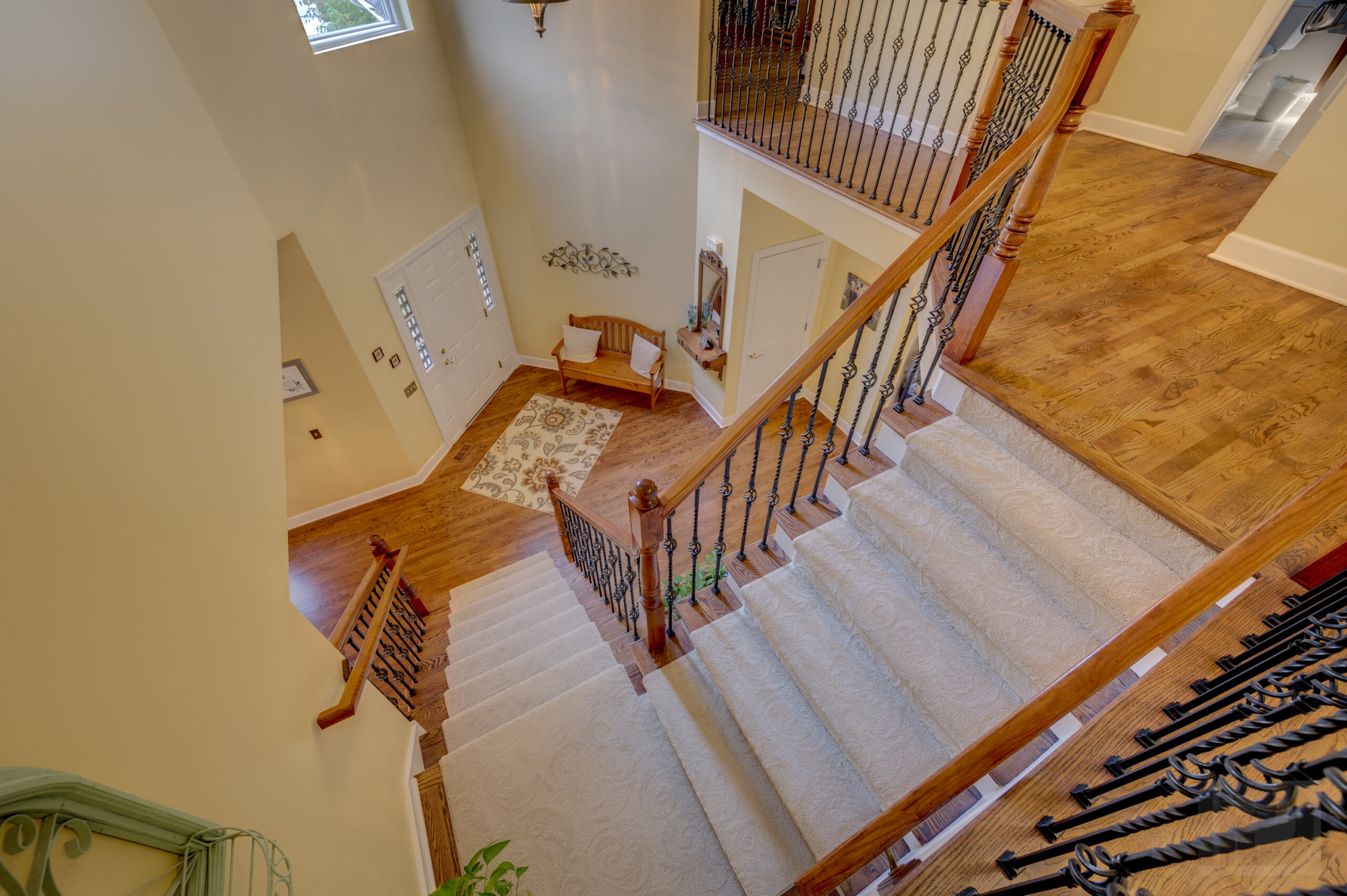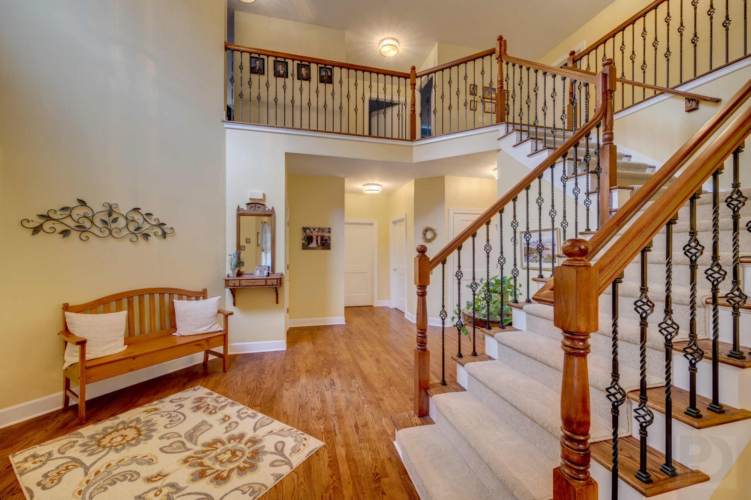 The foyer entry was redesigned with metal stair spindles and a patterned neutral carpet opening and brightening the space while retaining the oak base.