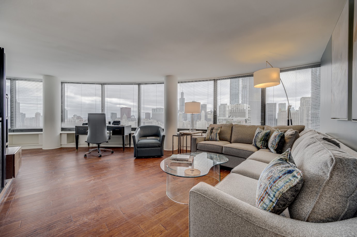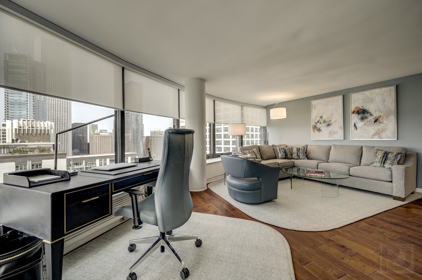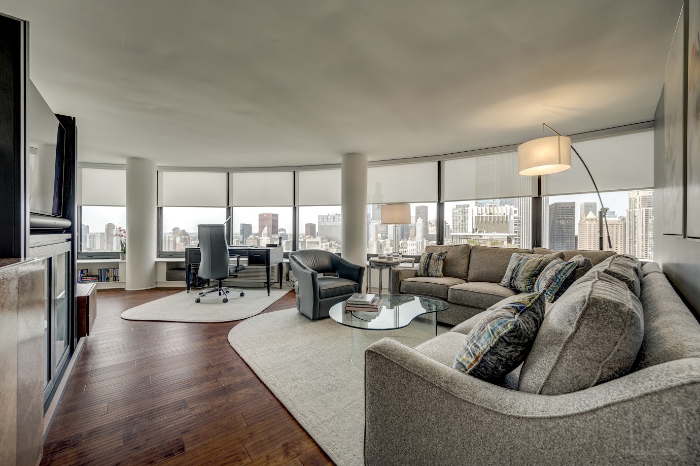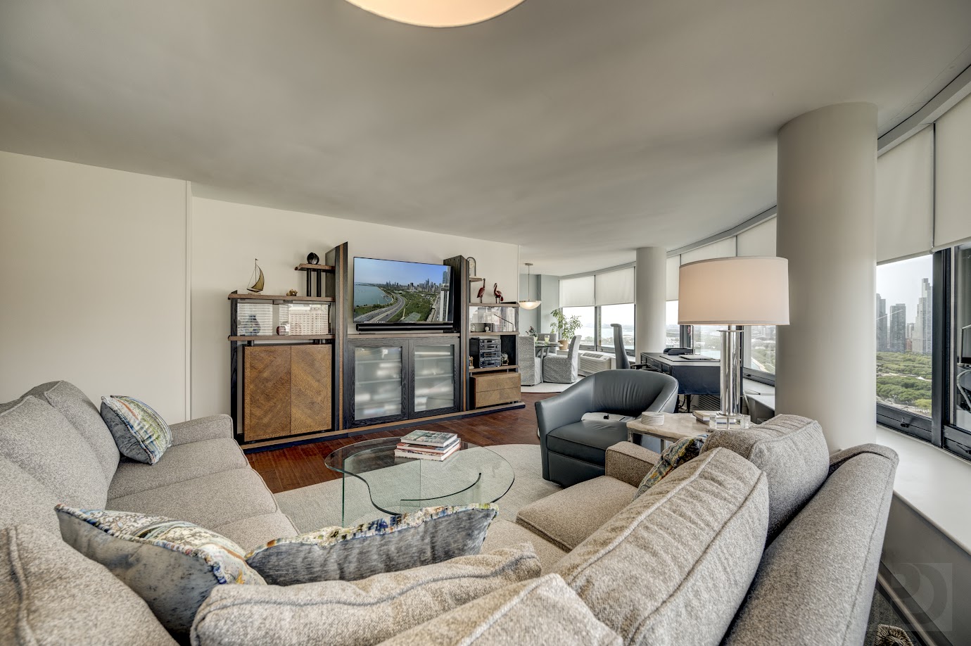 Our client desired a complete update to their downtown luxury condo on the Lake. The design focuses on enhancing comfort and flexibility while highlighting the beautiful views. We re-designed a custom media center, balanced with a custom-sized neutral sectional with artistic accent pillows and leather swivel seating.