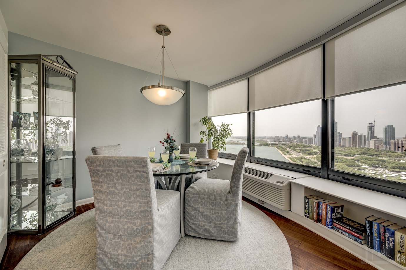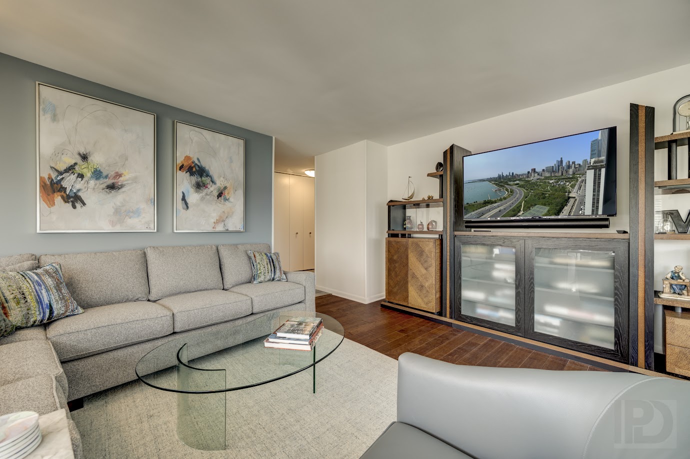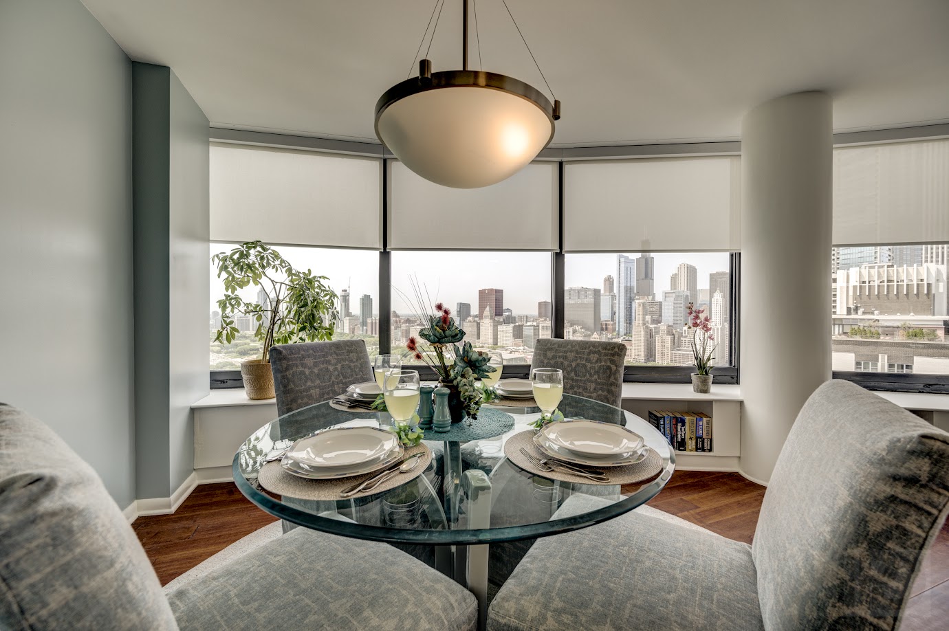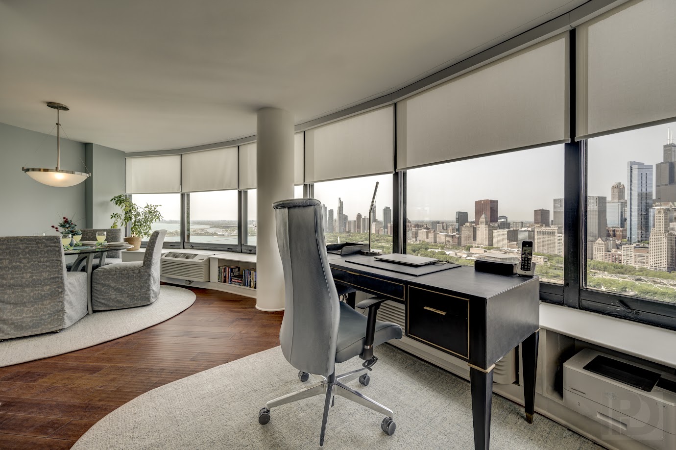 Our client desired a complete update to their downtown luxury condo on the Lake. The design focuses on enhancing comfort and flexibility while highlighting the beautiful views. We re-designed a custom media center, balanced with a custom-sized neutral sectional with artistic accent pillows and leather swivel seating.