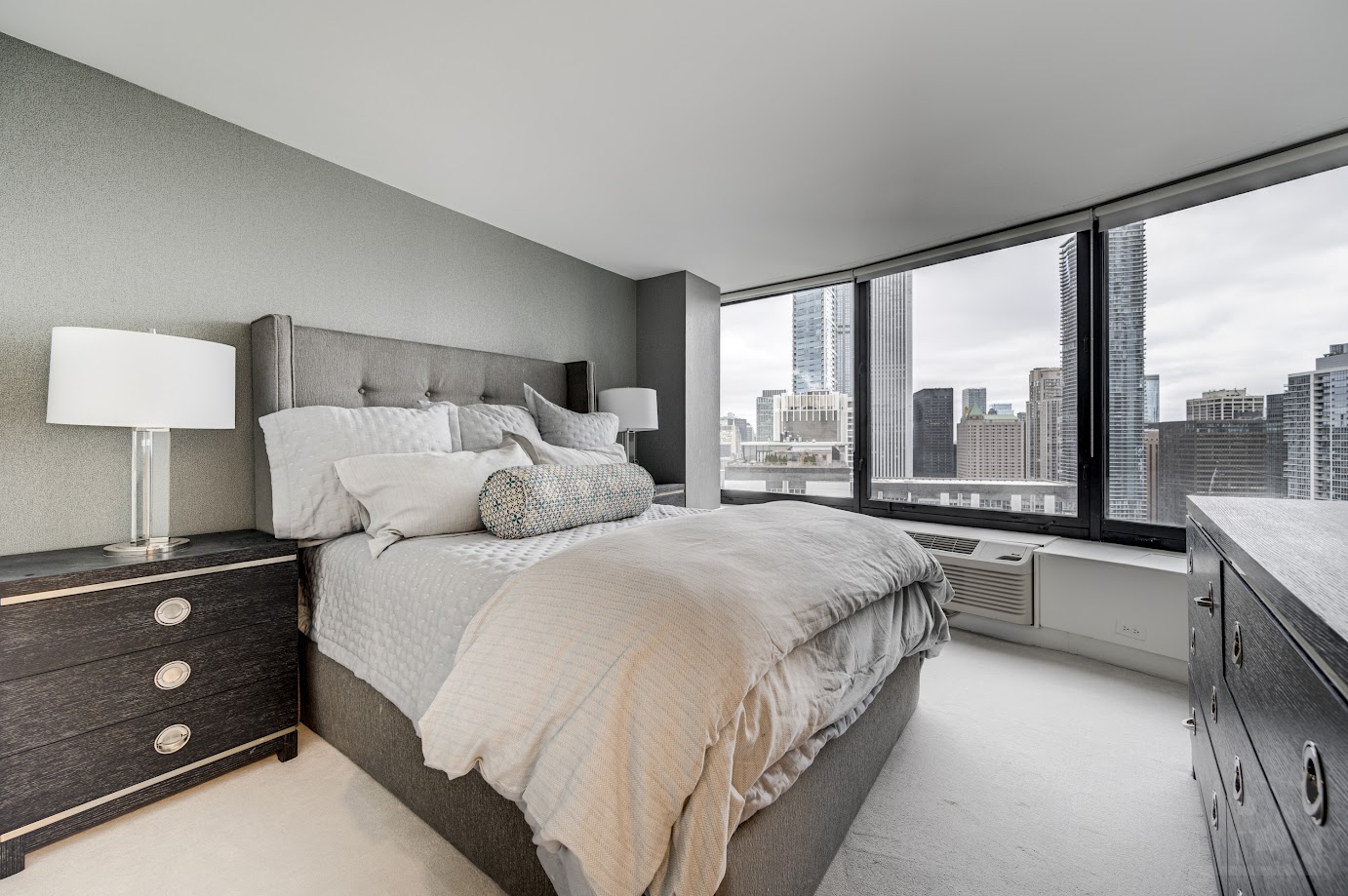 We designed a custom bed surround with a textured wallcovering backdrop and elegant wood furnishings to complement the metropolitan style bedroom suite and added a custom closet to enhance storage.