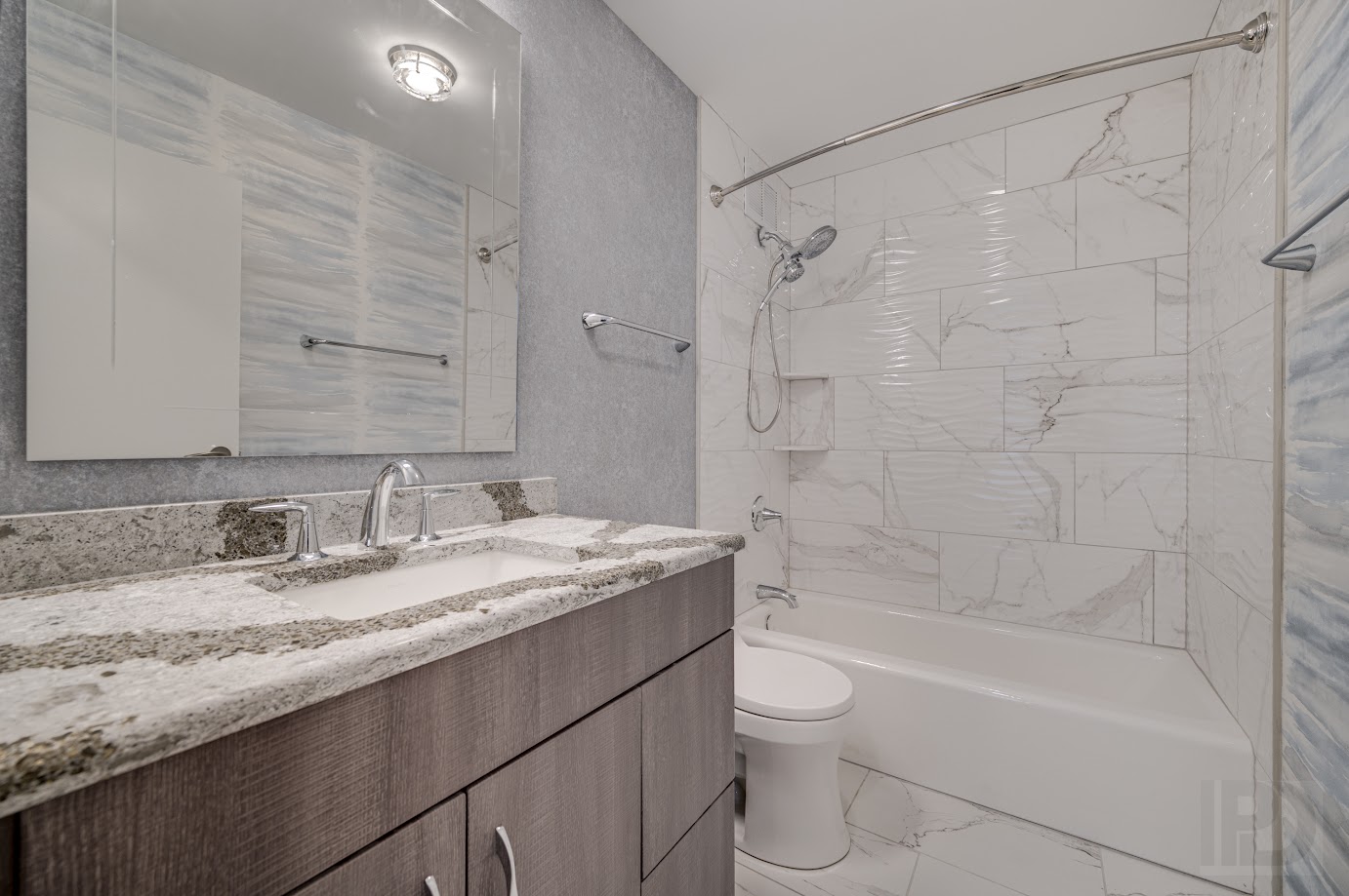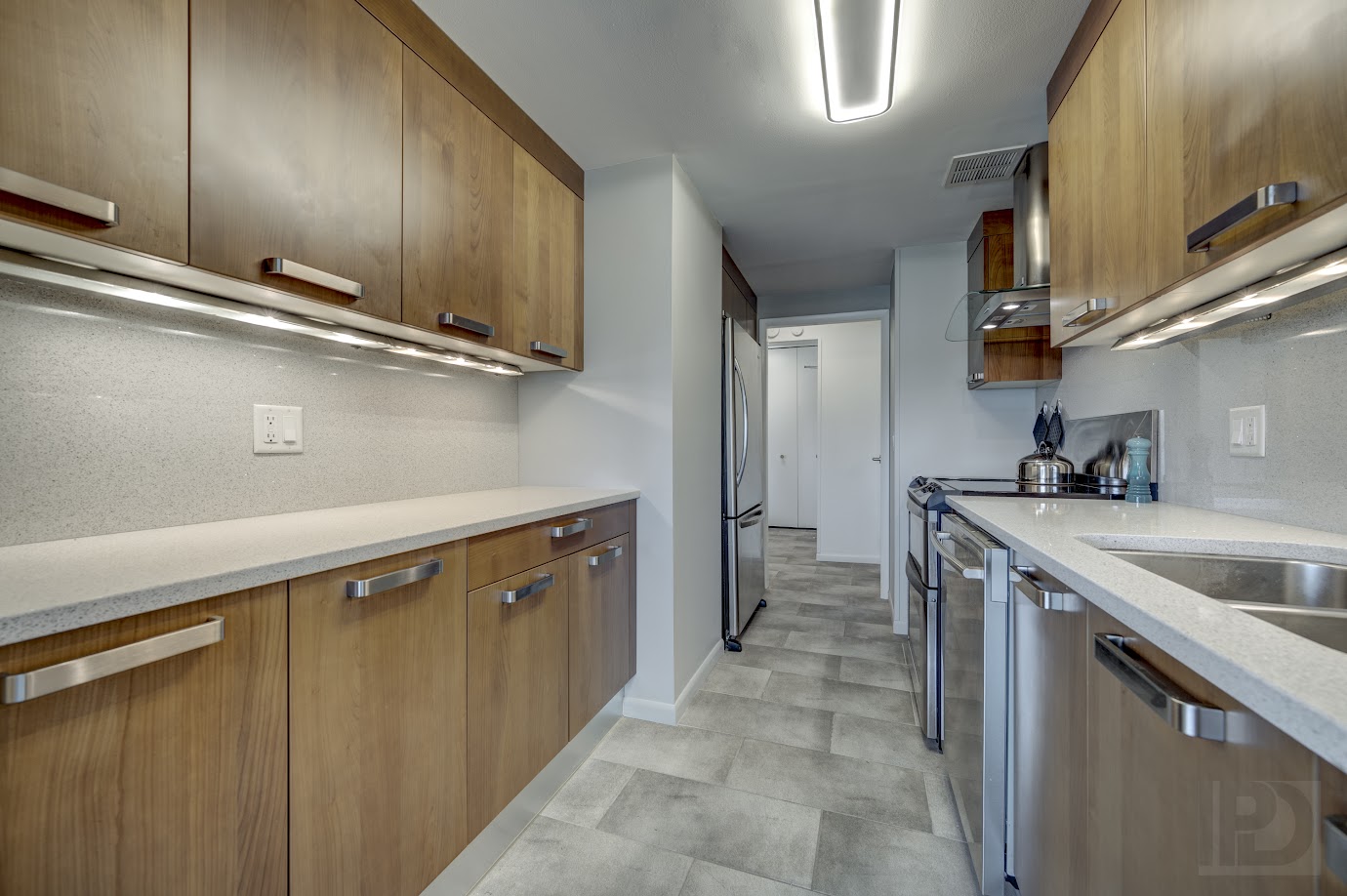 The highly efficient galley kitchen incorporates wood cabinets with full height quartz backsplash and contemporary appliances.
