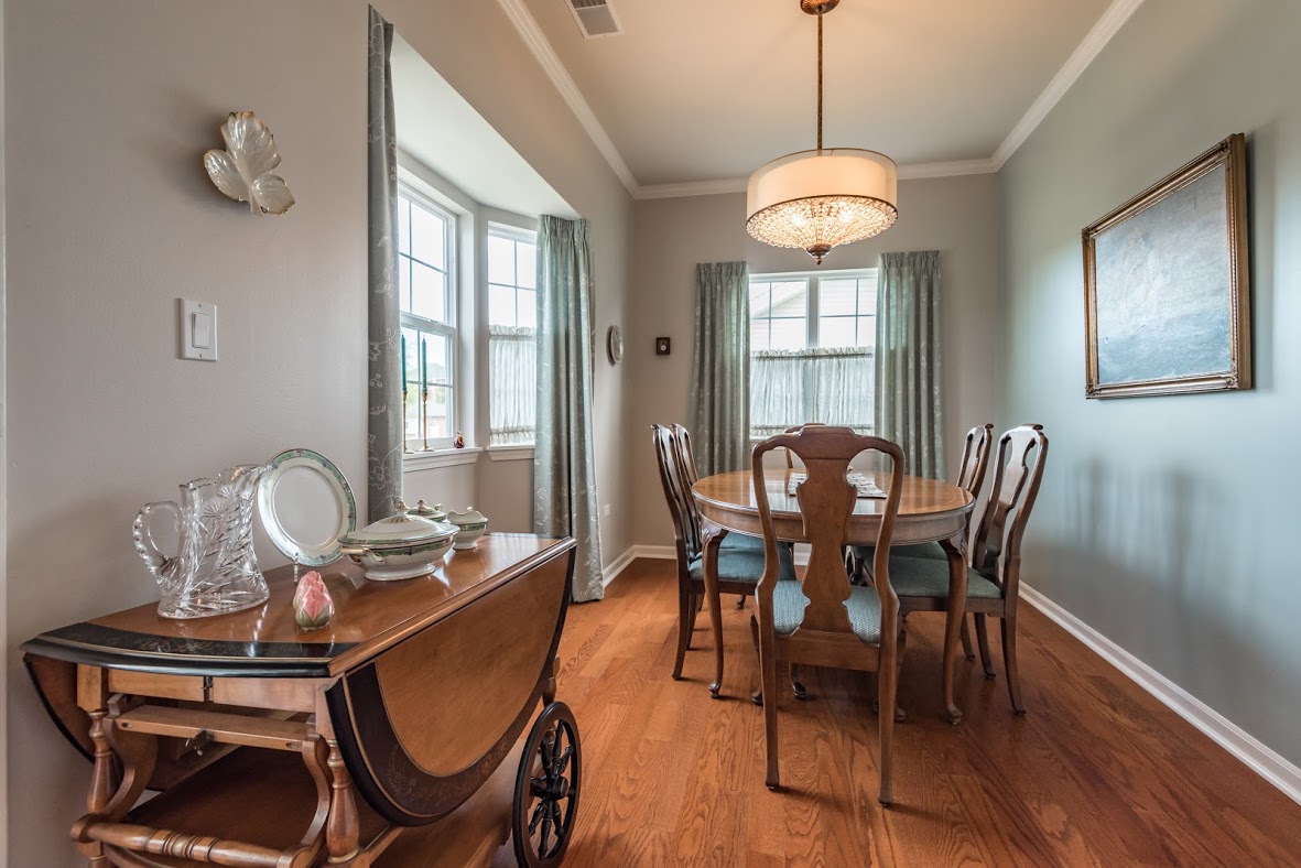 A high half wall was removed and a new half wall with a column was created as a foray affect to the master bedroom. Light charcoal gray color chosen for the gallery of family photographs. Accent color used in the dining area with white wainscot throughout. A separation with connection of continuity.