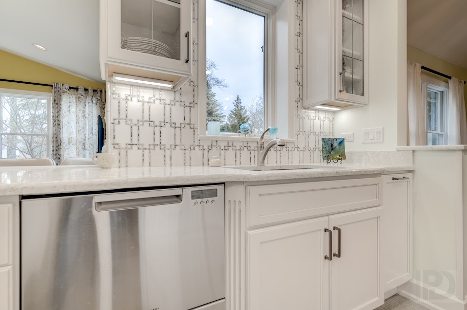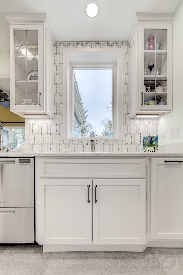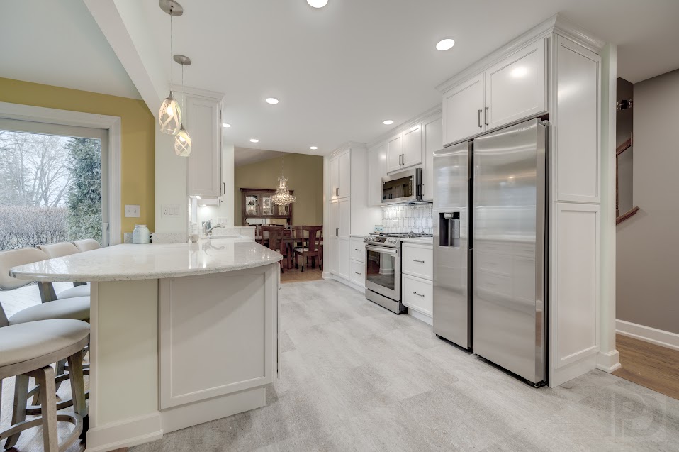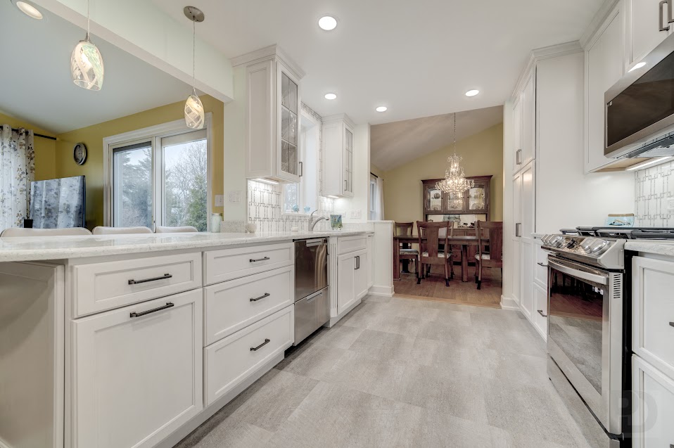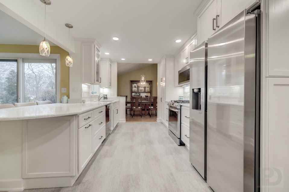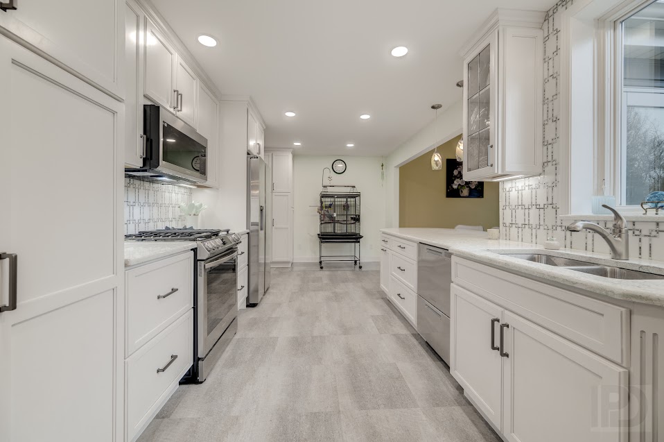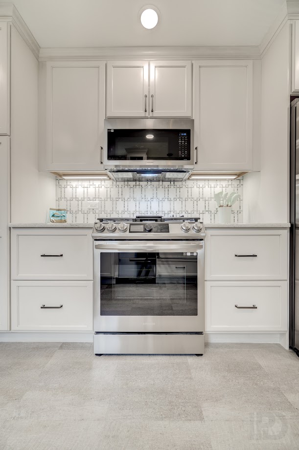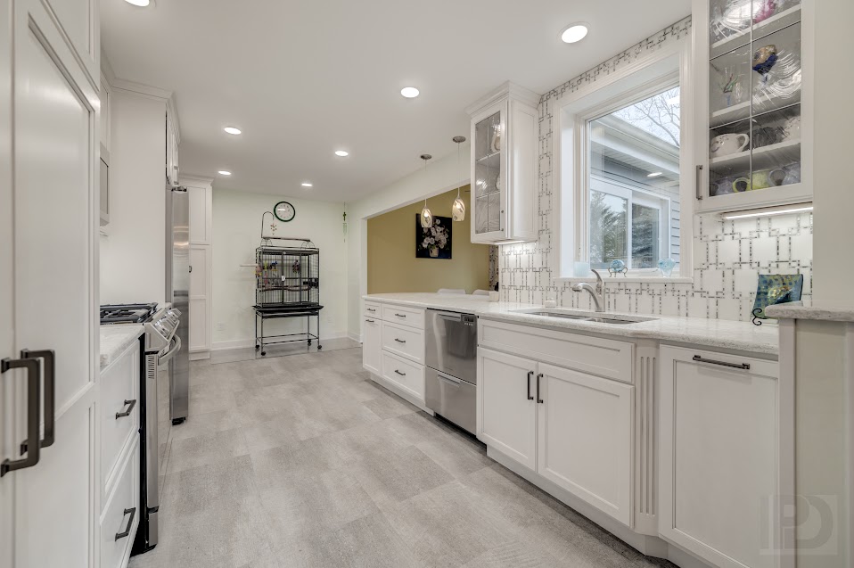 The kitchen was completely transformed from a 1971 outdated style into a modern, highly functional space with new, snowy, white cabinets, professional cooktop, upgraded lighting, a marble backsplash, granite countertops, and a separate microwave convection oven with spacious pantry. We converted the peninsula into a larger island with ample storage space. and converted an unused desk area was converted into a large pantry area; a charging station was incorporated. LED under-cabinet lighting was also installed throughout the entire kitchen area for a dramatic effect. Our client loves their new kitchen and home!